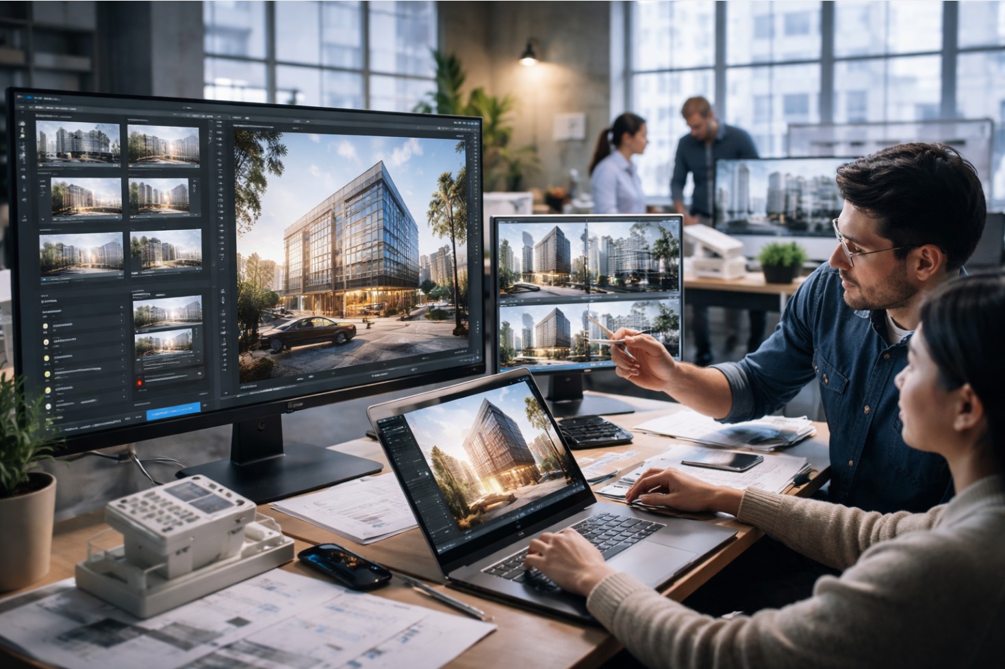 Besonders deutlich zeigt sich diese Entwicklung im Bereich Rendering, ArchViz und generative KI. Der bisher eher nachgelagerte Visualisierungsschritt verschiebt sich immer stärker in frühe Entwurfsphasen. Statt erst am Ende eines Projekts aufwendige Renderings zu erzeugen, werden heute bereits aus Skizzen, Modellen und Massing-Studien sehr früh stimmungsvolle Entwurfsbilder und Varianten generiert. Genau diese Richtung verfolgen aktuelle Werkzeuge wie Veras 4.0, D5 Render 3.0, MyArchitectAI und Autodesk Forma Site Design.