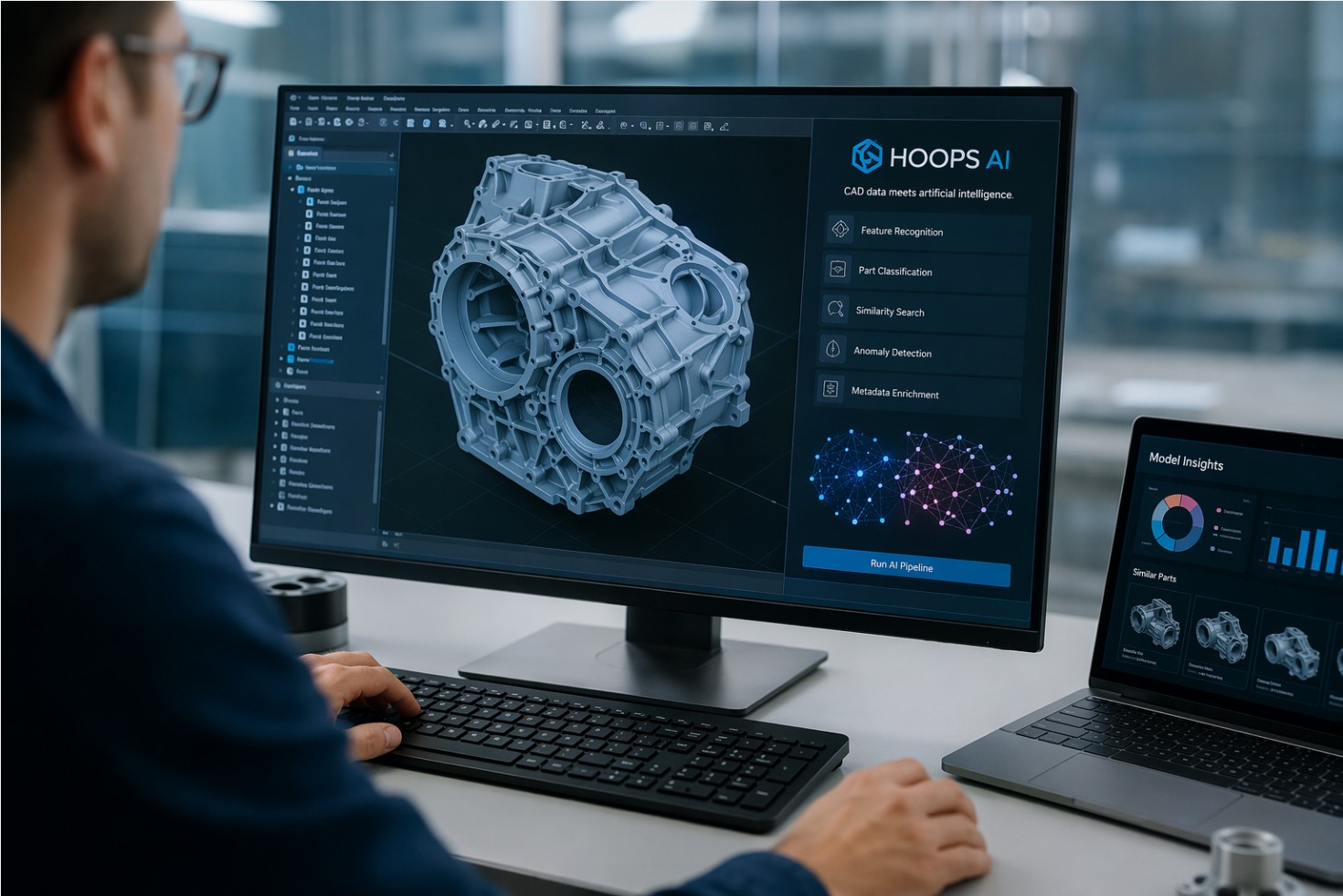Der entscheidende Punkt ist dabei nicht ein einzelnes KI-Feature, sondern die Plattformlogik dahinter. Laut Produktbeschreibung vereint HOOPS AI den Zugriff auf CAD-Daten, die Aufbereitung großer Datensätze, CAD-spezifische Encodings, Visualisierung sowie die Steuerung reproduzierbarer Experimente in einer durchgängigen Toolchain. Die Lösung richtet sich ausdrücklich an Data Scientists, ML-Ingenieure und Softwareentwickler, nicht primär an klassische Endanwender im Planungsbüro.